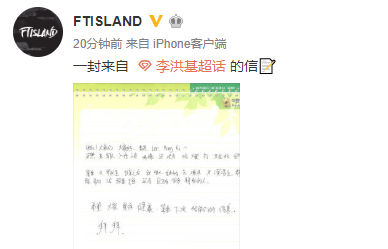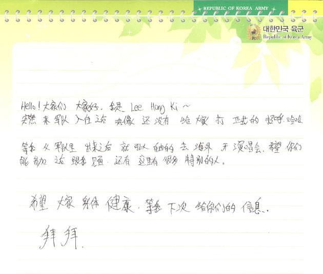 網易娛樂10月23日報道 10月23日,FTISLAND官博發布了一張李洪基手寫的中文信,內容為:“hello大家好我是李洪基!突然來軍隊入住之后,好像還沒有給大家打正式的招呼,哈哈。等我從軍隊里出來之后,就可以自由的去海外開演唱會,希望你們能參加之后跟我見面,還有這里有很多特別的人。希望大家身體健康,等我下次給你們的信息,謝謝。”