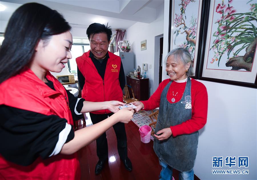 10月23日,雉城街道所前社區的黨員志愿者上門為72歲的吳阿寶老人(右一)送去辦好的老年優待證,這也是黨員志愿者為獨居老人代辦各類證件“最多跑一次”服務舉措之一。 從2019年9月開始,浙江省長興縣雉城街道積極開展“不忘初心 牢記使命”主題教育,雉城街道下轄各個社區的黨員志愿者們開展“認領微心愿 上門送服務”活動。黨員志愿者們上門收集轄區困難戶、困難兒童和獨居、孤寡老人的“微心愿”,并結對幫助實現這些“微心愿”,同時黨員志愿者們還積極響應“最多跑一次”,為轄區需辦證人員代辦并上門送上辦好的老年卡、殘疾人證等。 新華社記者 徐昱 攝