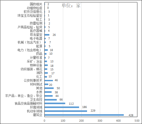 按照檢驗檢測機構從業主業分類統計,我省檢驗檢測機構共涉及30個行業領域,主要集中在6個行業領域。其中,建筑業428家,占比30.8%;機動車領域229家,占比16.5%;環境領域186家,占比13.4%;食品及食品接觸材料112家,占比8.1%;衛生疾控66家,占比4.7%;農林漁牧44家,占比3.2%。