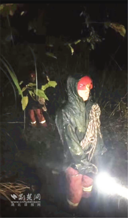 此后,由惠佳鑫帶領的應急救援搜救小隊來到竹山縣田埡村,當經過一處位于半山腰的已經空置垮塌的土屋時,發現在通往屋后山上的灌木林有新近被折斷的樹枝和踩踏過的痕跡,他們循著痕跡搜索前進。兩名搜救隊員連摔了幾跤,一名搜救隊員的雨褲從膝蓋以下被生生撕脫,搜救隊員的雙手也被荊棘劃出了多道血口。他們全然顧不了這些,沿途不間斷地大聲呼喊被困人員的姓名。