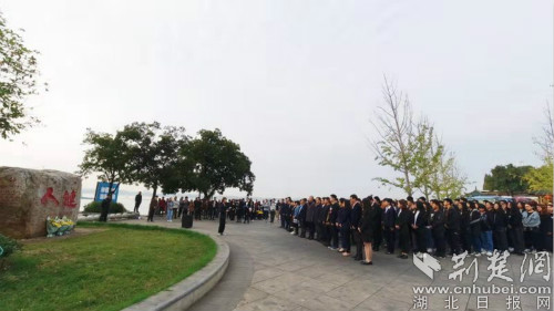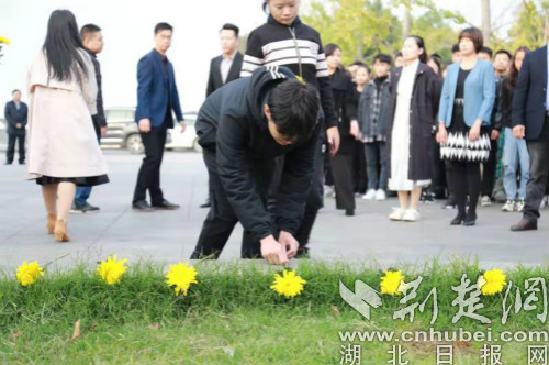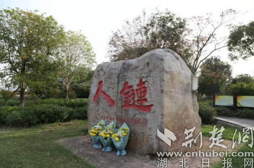 長江大學師生代表在“人鏈”紀念碑前舉行祭奠儀式。(通訊員供圖)