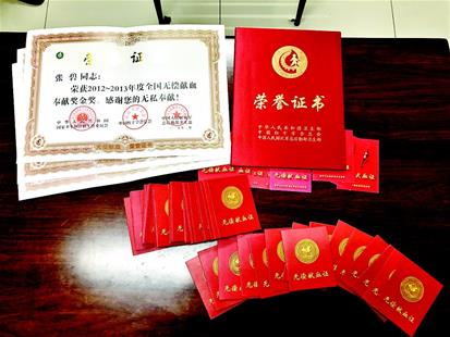 昨日,在城投物業的辦公室里,張碧向楚天都市報記者出示了她的部分獻血證和榮譽證書,其中獻血證共52本(每本可登記多次獻血記錄),全國無償獻血奉獻獎金獎證書6張。無償獻血奉獻獎每兩年評一次,志愿者在評選年度前的累計獻血次數達40次以上,方可獲評金獎。證書顯示,從2006年到2017年,張碧連續獲得6次金獎。