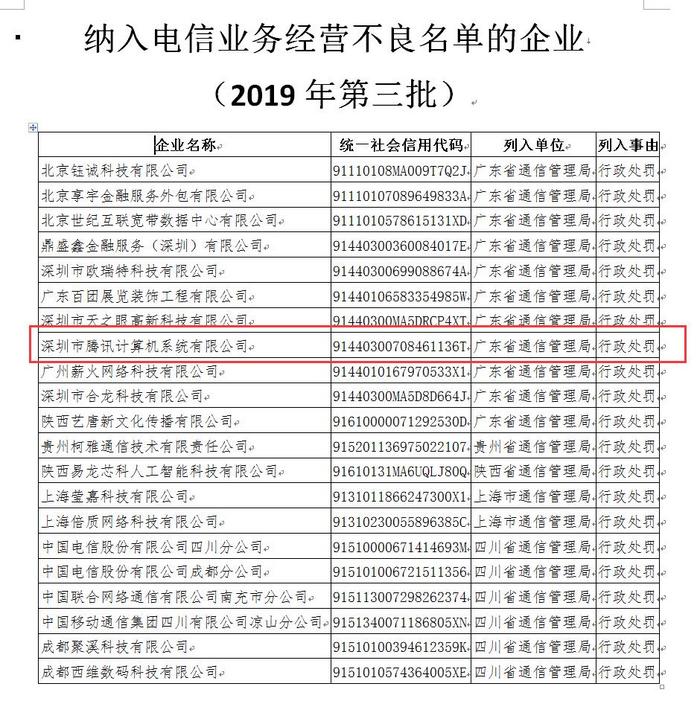 騰訊被納入電信業務經營不良名單