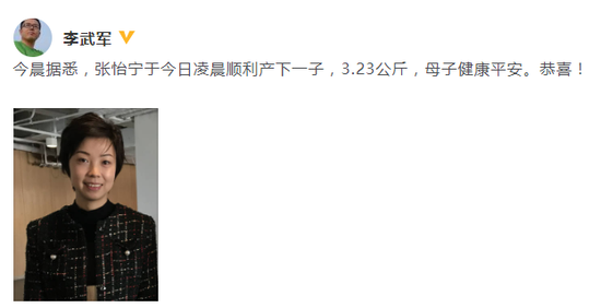 網易娛樂10月30日報道 10月30日早上,有資深媒體人在微博發文稱:“今晨據悉,張怡寧于今日凌晨順利產下一子,3.23公斤,母子健康平安。恭喜! ”