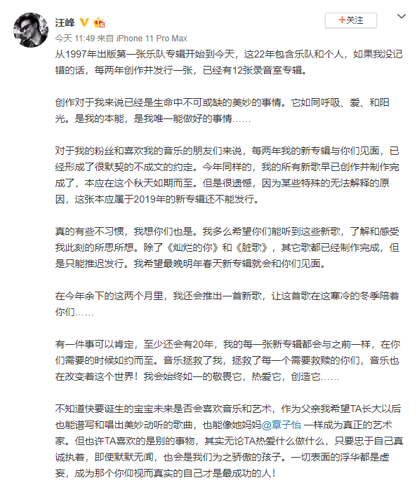 對于我的粉絲和喜歡我的音樂的朋友們來說,每兩年我的新專輯與你們見面,已經形成了很默契的不成文的約定。今年同樣的,我的所有新歌早已創作并制作完成了,本應在這個秋天如期而至。但是很遺憾,因為某些特殊的無法解釋的原因,這張本應屬于2019年的新專輯還不能發行。