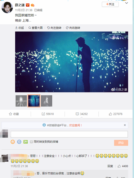 而在當日的演出結束后,薛之謙曬出音樂節表演的照片,并配文:“我回家睡覺啦~”,眾多粉絲紛紛在評論中喊話,讓其注意安全。據悉,這已經不是薛之謙第一次在舞臺上摔倒,在之前的演出中,薛之謙也有出現意外的情況。