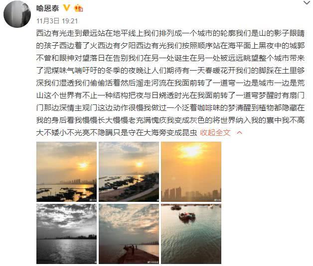 網易娛樂11月5日報道 11月3日,喻恩泰迎來了自己42歲的生日,他在社交平臺上寫了一首301字的長詩,并配上幾張風景照片,為自己慶生。詩中寫道:“西邊有光,走到最遠,站在地平線上,我們排列成一個城市的輪廓,我們是山的影子,眼睛的孩子,西邊著了火,西邊有夕陽……”結尾他寫道:“我不高大,不矮小,不光亮,不隱瞞,只是守在大海旁,變成昆蟲”。