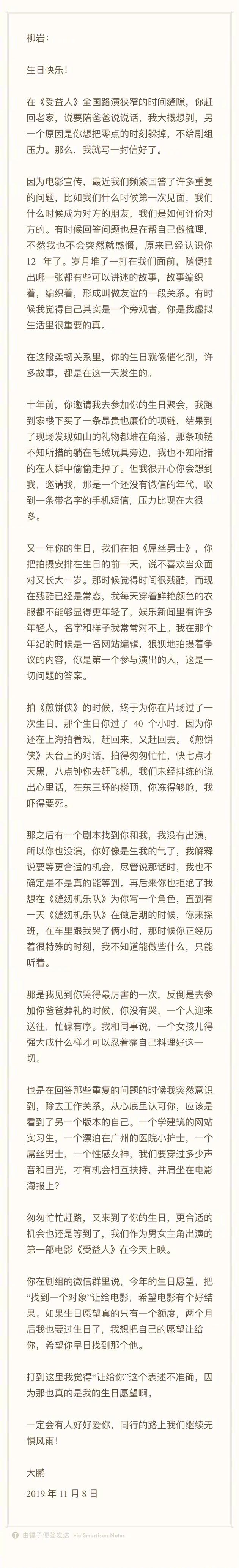 大鵬還在文末表示,柳巖今年把“找到一個對象”的生日愿望讓給了《受益人》,祈愿這部片子有好成績。而大鵬則愿用自己的生日額度為柳巖許一個愿:希望她早日找到那個“他”。