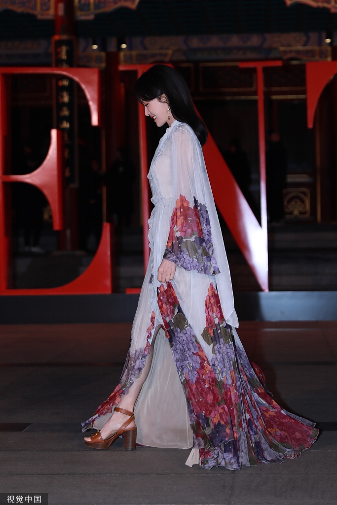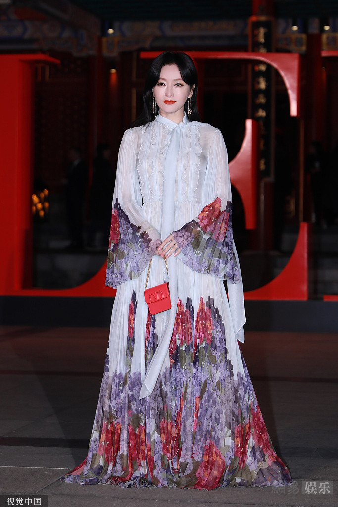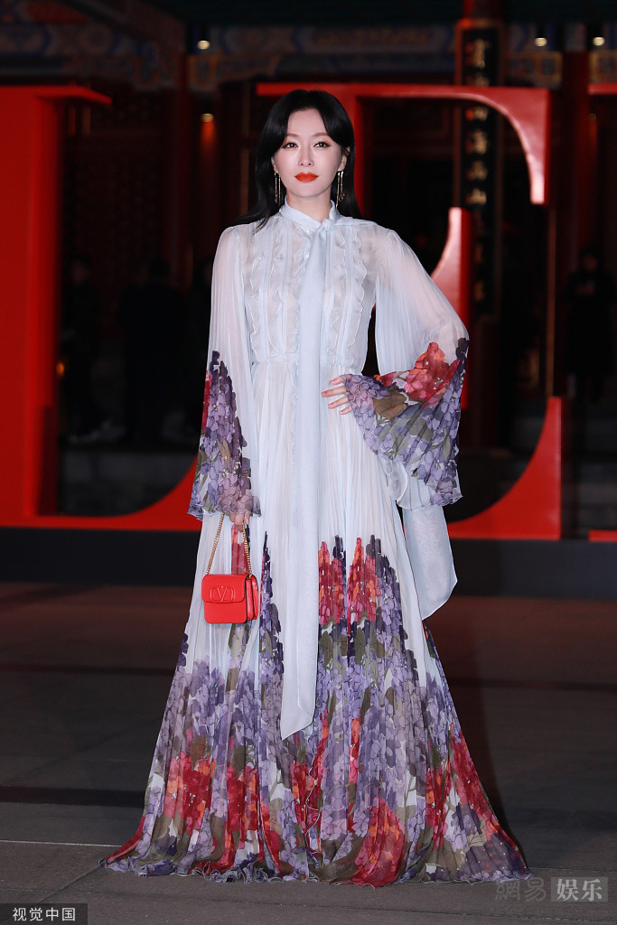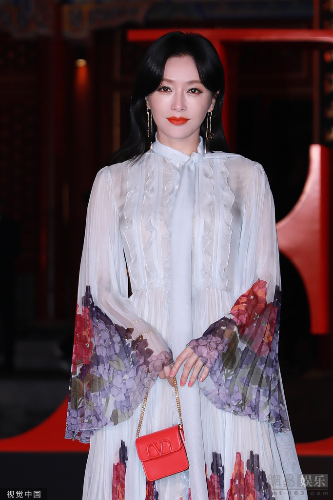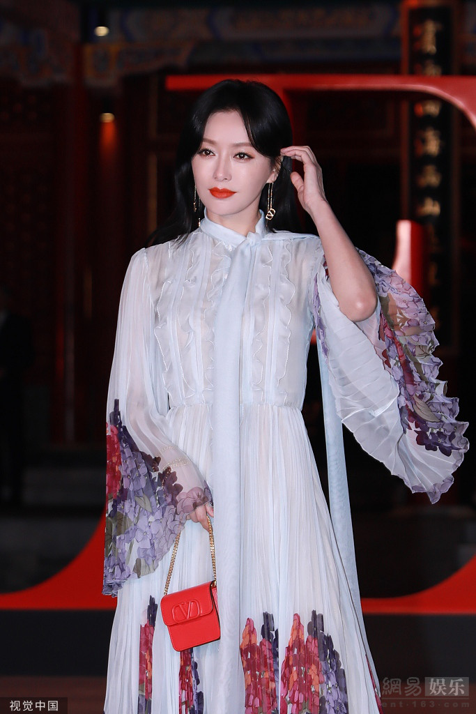 7日,北京,秦嵐現身某時尚活動,她身穿白底印花長裙亮相仙氣十足,雪膚紅唇美若畫中人。