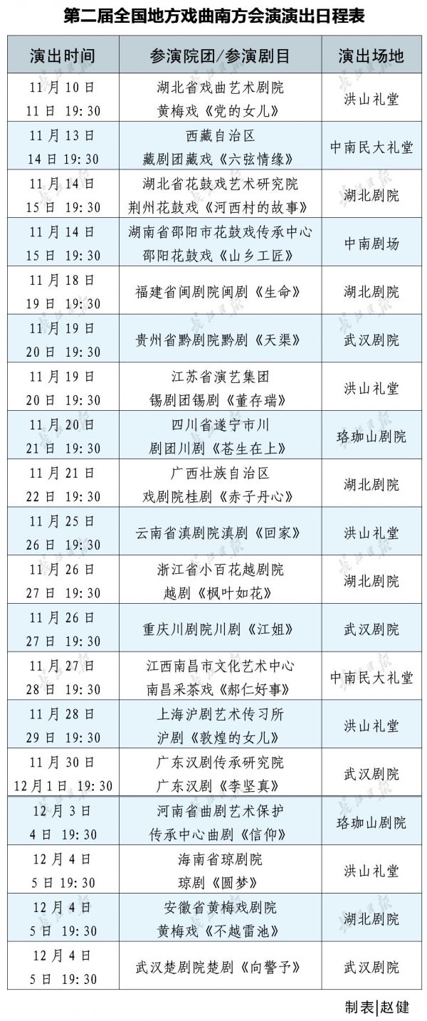 作為全國南方片區戲曲藝術的大會演,各劇種都派出了高水平的作品與團隊參加,可謂名家薈萃。11月10日,湖北省戲曲藝術劇院創作的黃梅戲《黨的女兒》將為會演開幕,中國戲劇梅花獎得主楊俊將領銜主演。12月5日,武漢楚劇院創作的楚劇《向警予》將作為閉幕演出上演,中國戲劇梅花獎得主夏青玲將擔任主演。而在11月26日、27日,重慶川劇院還將帶來川劇《江姐》,主角為“三度梅”獲得者沈鐵梅。
