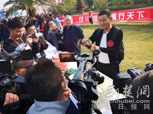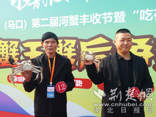 2019年度漢川河蟹爭霸賽中,蟹王蟹后出爐,12號公蟹凈重近1斤,15號母蟹凈重8兩。