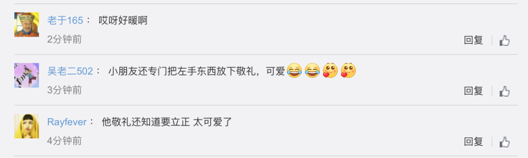 這一幕,感動了一眾網友,網友紛紛點贊“哎呀好暖啊”“敬禮還知道要立正,太可愛了”“你給他們敬禮,我們給你點贊”!