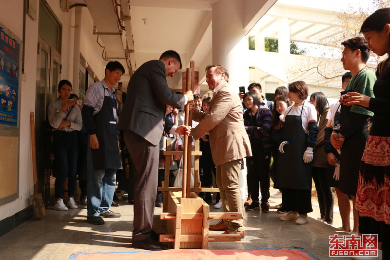 2018年,在廈大嘉庚學院舉辦的閩南傳統(tǒng)建造技藝研討會中,來賓體驗土樓夯土。劉可鑫 攝
