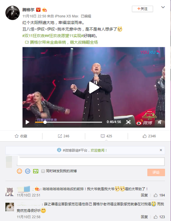 網友看到微博后留言稱:“我大爺就是我大爺,唱的太帶勁了!”“薛之謙唱這首歌感覺在唱他自己,騰格爾老師唱這首歌感覺就像在對我唱”“騰哥也太皮了!”