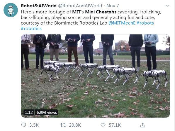 據報道,視頻中,9條“迷你獵豹”或列隊行進、或集體后空翻、還上演了一場激烈足球賽,充分展現了其運球、跑動和跳躍的能力。這些銀色的機器人和波士頓梗犬的大小差不多,奔跑姿勢也一樣充滿活力,非常可愛。