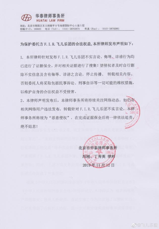 網易娛樂11月13日報道 11月13日,飛兒樂團發布嚴正聲明,稱有部分網絡大V發表不實言論,懟新主唱韓睿進行侮辱、誹謗及人身攻擊。望侵權者自行刪除所有不實信息,否則將采取一切可能的措施維權,以保障自身的合法權益不受損害。
