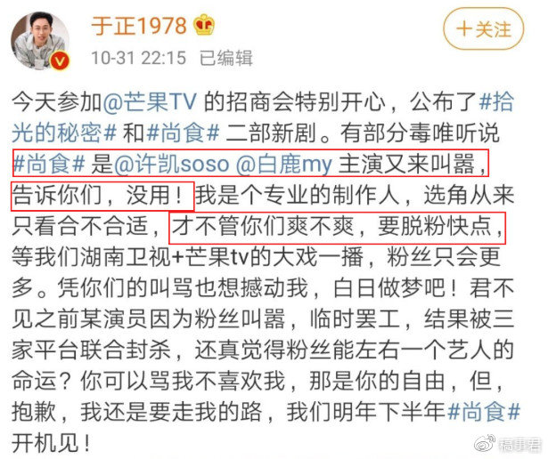 許凱和白鹿的粉絲因為兩人關系過于親密撕x,于正偏要發微博告訴粉絲,他們倆還要繼續合作好幾部戲;