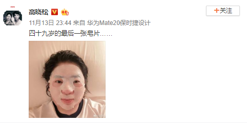 網易娛樂11月14日報道 11月13日晚,高曉松在微博曬出一張自拍照,寫道:“四十九歲的最后一張皂片…… ”只見他穿著白色上衣躺在床上,頭發濕濕的似乎剛洗完澡,臉上還敷著面膜,十分精致。