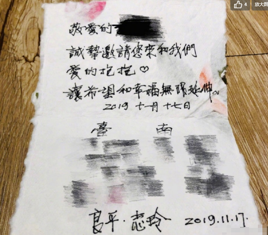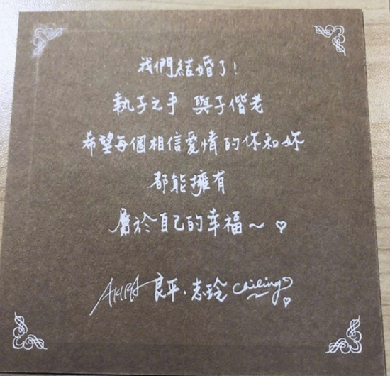網易娛樂11月14日報道 14日,林志玲婚禮的喜帖曝光,封面以她和AKIRA燙印封口,伴手禮選用了蛋卷和巧克力。據悉,邀請內容由林父撰寫,“愛的抱抱”超甜,林志玲則在夫妻合照的背后寫下,“我們結婚了,執子之手與子偕老,希望每個相信愛情的你和你,都能擁有屬于自己的幸?!?。林志玲與丈夫將于11月17日在臺南美術館舉辦婚禮。