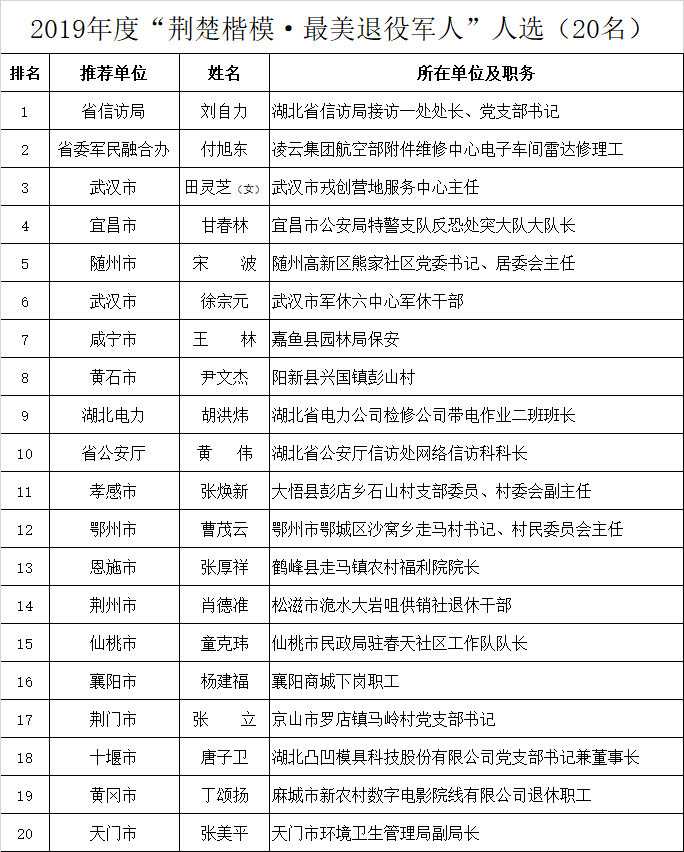 附:2019年度“荊楚楷模·最美退役軍人”人選(20名)
