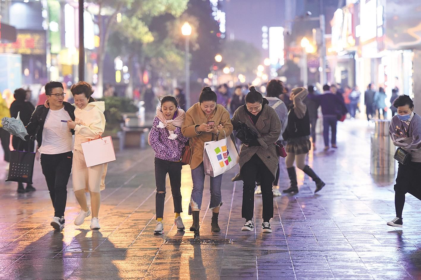 十一月十七日晚七時,武漢江漢路步行街,市民游客頂風前行。當日,一股強冷空氣來襲,給武漢帶來大幅降溫,并伴有五級至六級北風。武漢一夜入冬。(湖北日報全媒記者 李溪 攝)