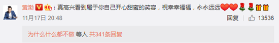 網易娛樂11月18日報道 17日,林志玲婚禮在臺南舉行,黃渤因來不及辦理證件遺憾不能前去。他在林志玲的微博留言送上祝福:“真高興看到屬于你自己開心甜蜜的笑容,祝幸幸福福,永永遠遠”。此前,在《極限挑戰》中,黃渤曾走心喊話林志玲 ,“希望有天能看到你臉上露出真正的,不是劇本里的笑容,希望你一生幸福”。