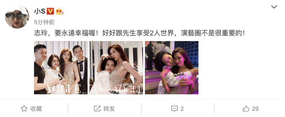 11月18日,小S在曬出和林志玲在婚禮上的合照,并送上小S風格式的祝福:“志玲,要永遠幸福喔!好好跟先生享受2人世界,演藝圈不是很重要的!”小S不忘在溫馨的時刻還要“勸”一下林志玲別管不重要的演藝圈,可以看出兩人關系十分要好。