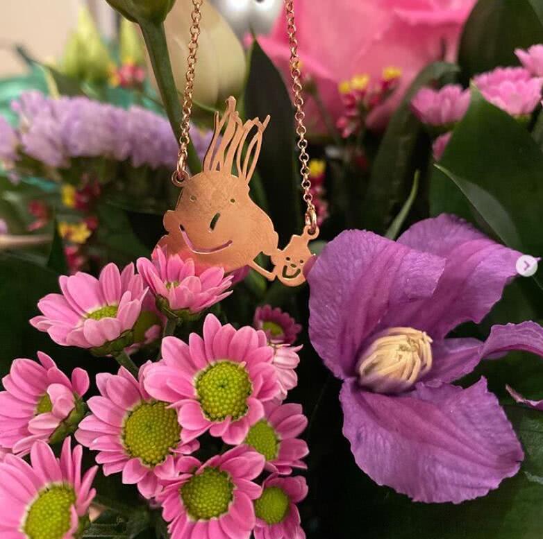 章澤天曬出女兒的畫制作的項鏈,項鏈中有頭發的大頭笑臉應該是她,而旁邊的小頭笑臉當然就是可愛的女兒了。仔細看兩人還緊緊牽著對方的手,看起來特別溫馨讓人感動。