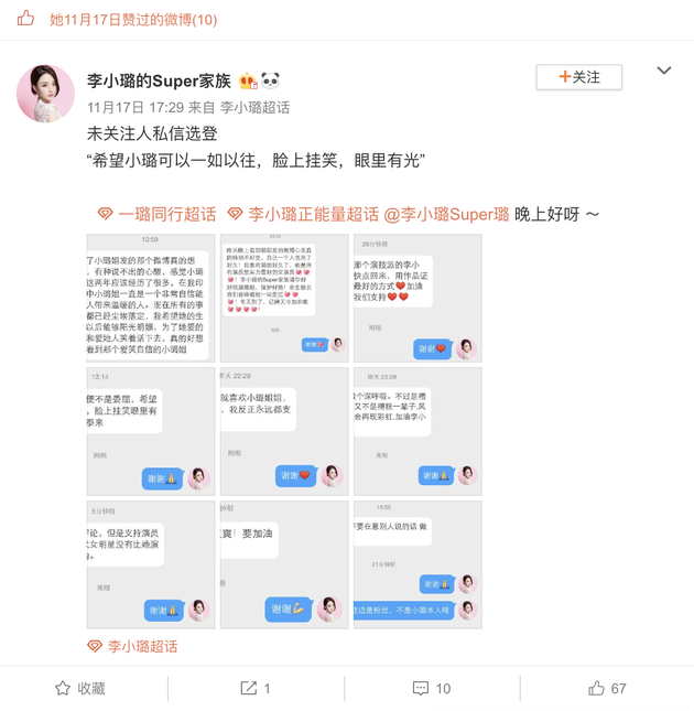 據悉,“李小璐的Super家族”是粉絲自發組成的應援博,在多次風波中都一如既往力挺李小璐。而李小璐媽媽上次更新動態,還是轉發賈乃亮影迷會制作的賈乃亮和甜馨的視頻合集。