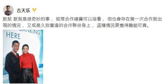 網(wǎng)易娛樂11月19日報道 11月19日,古天樂曬出一張和老友宣萱的照片,并發(fā)文談對默契的感想:“默契是很奇妙的事,經(jīng)常合作確實可以培養(yǎng),但也會存在第一次合作就出現(xiàn)的情況,又或是久別重逢的合作伙伴身上,這種情況更覺得難能可貴。 ”
