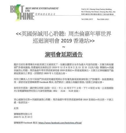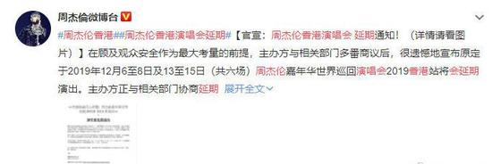 網易娛樂11月19日報道 周杰倫香港演唱會官方發布延期通告,安全最重要,一切以安全至上,未來在合適的時間合適的地點再次相遇。