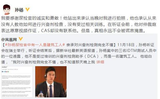 網易娛樂11月19日報道 11月19日,孫楊轉發尿檢官中一人是建筑工作的新聞,他表示:“我要感謝尿檢官的誠實和勇敢!他站出來承認當晚對我進行拍照,他也承認從來沒有人教他如何進行興奮劑檢查,沒有受過相關訓練。在聽證會前,他對仲裁庭表達愿意視頻作證,CAS卻沒有聯系他。但是,真相永遠不會被謊言掩蓋。”