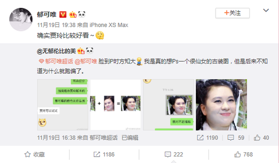 稍后,郁可唯轉發此微博并回應道:“確實賈玲比較好看!”網友被她們逗樂,紛紛圍觀并留言稱:“出來挨打!”“自黑界的新秀!”“姐是真的沒有偶像包袱。”