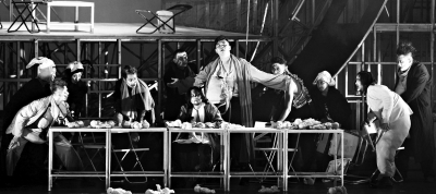 因此,從評論角度來說,對于孟京輝版《茶館》無論是贊美還是批評,都不應該只停留在“他敢大膽改編《茶館》”這個層次上。因為在此之前,李六乙的四川方言版《茶館》、王翀的校園版《茶館2.0》,都已經對《茶館》做出了非常具有新意的解讀和詮釋,邁出的步子也一點不比孟京輝小。而且老舍到底對各種改編會持什么樣的態度,到底是反感還是致辭,任何人實際上也無法妄加揣測。因此,面對全新改編的《茶館》,我們應該探討的,不是“改不改的問題”,也不是“老舍怎么看的問題”,而是“改得到底怎么樣的問題”“當代觀眾怎么看的問題”。不停留在情緒的宣泄,也不要把自己的觀點強加于人,大家各抒己見,百家爭鳴,才是對藝術、對藝術創作者和對普通觀眾都有益處的事情。(王潤)