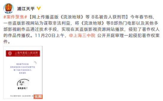 網易娛樂11月21日報道 今年春節檔,一些盜版影視網站為謀取非法利益,將《流浪地球》等8部熱門電影以及其他多部影視劇作品通過技術手段,實現在其盜版影視資源網站播放,侵犯了著作權人的作品傳播權。11月20日,上海三中院公開開庭審理這一起侵犯著作權案件。法院經過審理,當庭做出判決,8人獲刑。