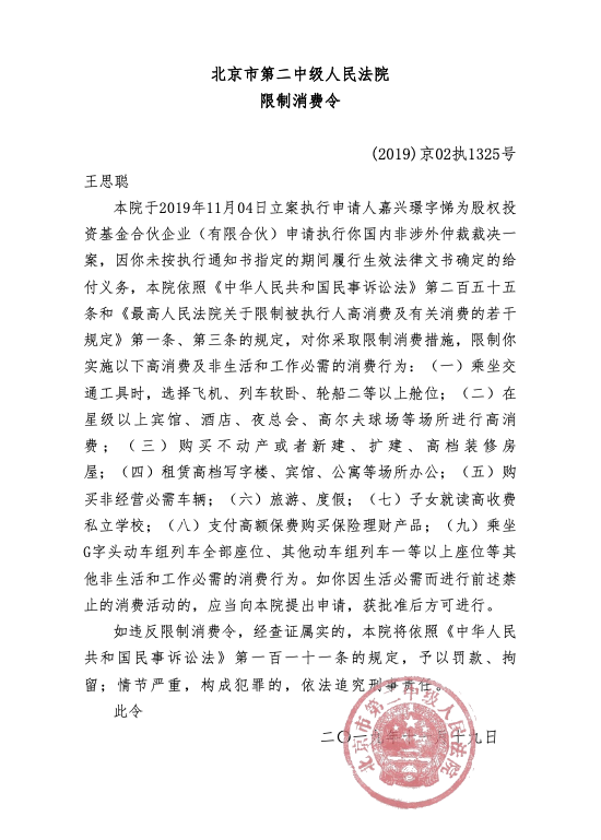 ↑法院向王思聰下達(dá)的限制消費(fèi)令