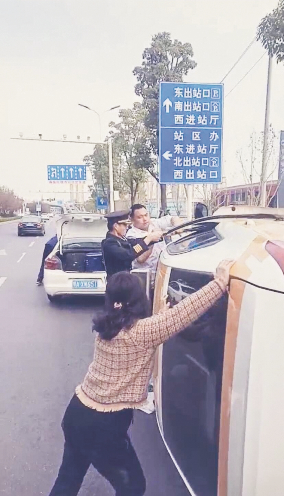 事發路段靠近武漢站西進站廳上匝道處,不斷有車輛經過,王女士連忙向過往車輛求助。此時,華昌出租車公司的哥胡相敏載客路過。今年57歲的胡相敏,開了20多年的士,看到是一輛的士側翻,他猜測里面肯定有人。胡相敏隨即把車停在路邊,對車上一男一女乘客說:“不好意思,那輛車出了事故,我得去幫忙救人。”