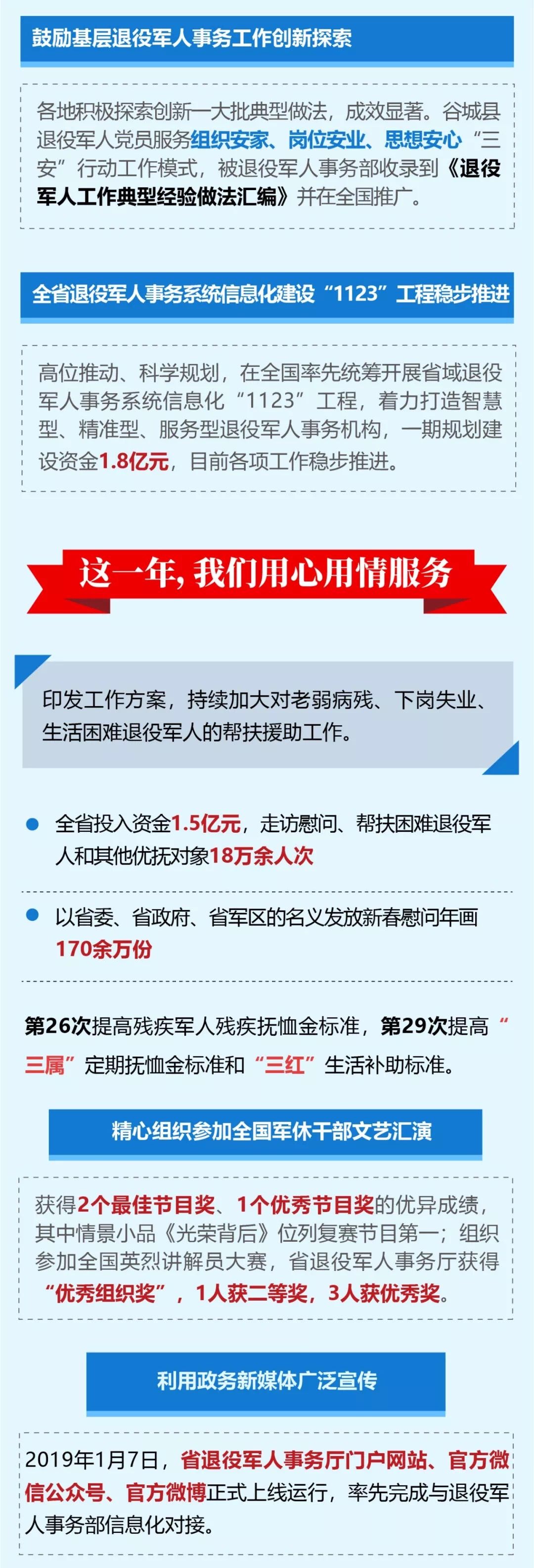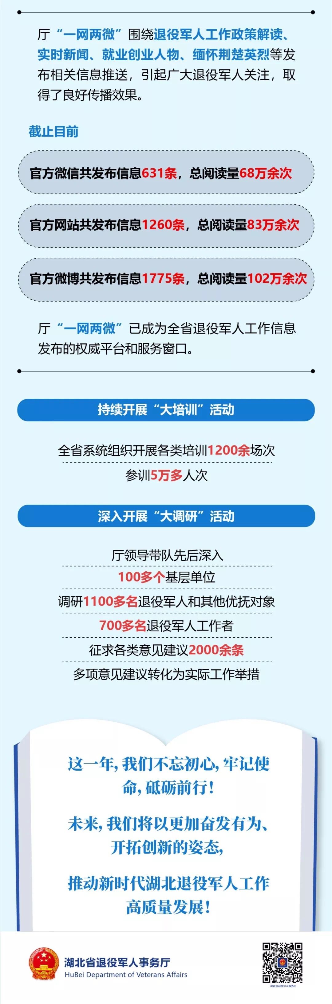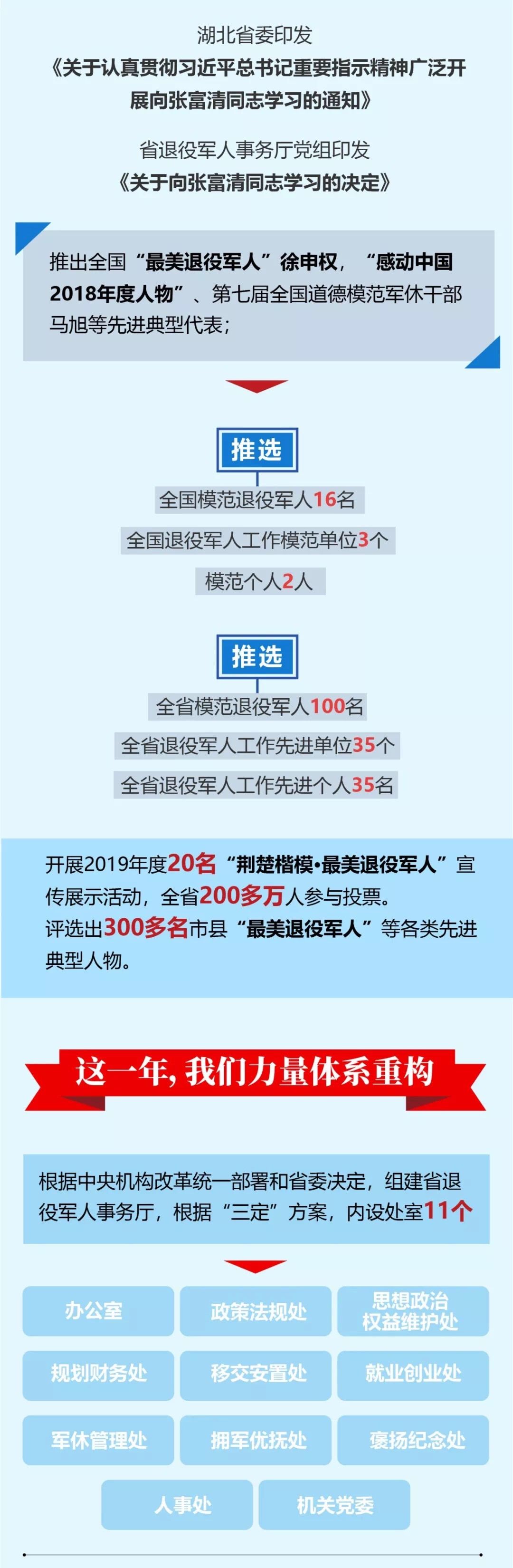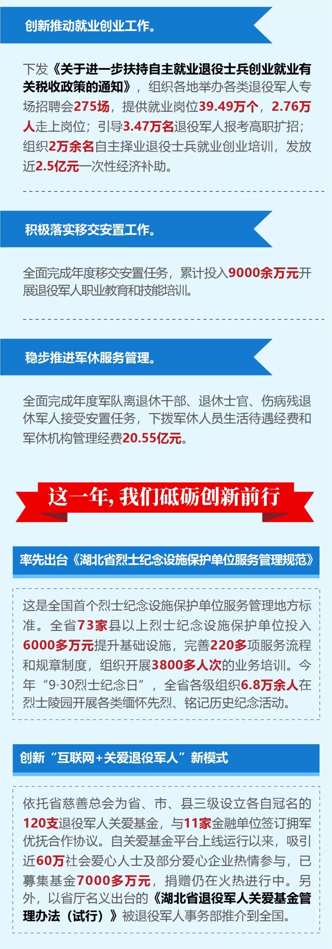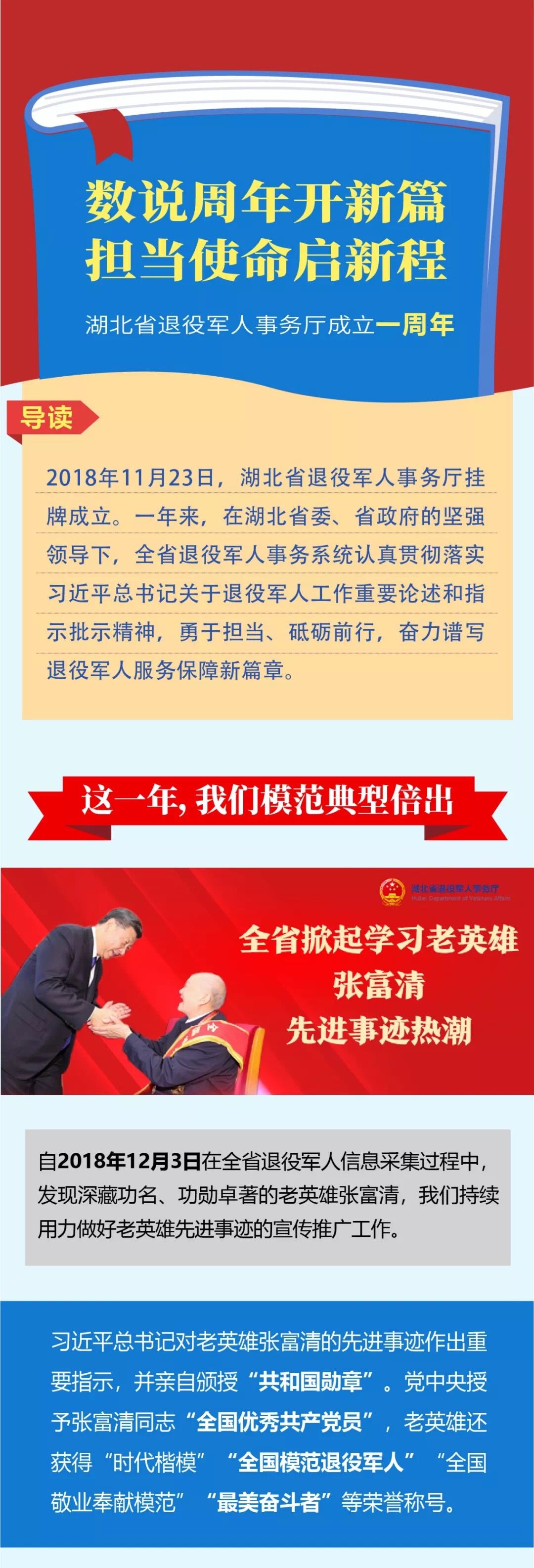 2018年11月23日,湖北省退役軍人事務廳掛牌成立。 一年來, 在湖北省委、 省政府的堅強領導下,全省退役軍人事務系統認真貫徹落實習近平總書記關于退役軍人工作重要論述和指示批示精神,勇于擔當、 砥礪前行,奮力譜寫退役軍人服務保障新篇章。