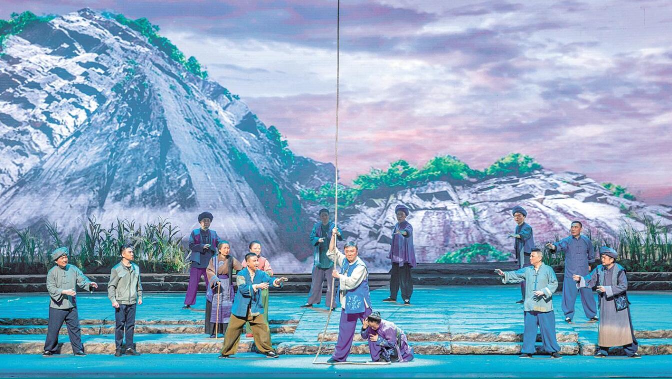 黔劇《天渠》在武漢劇院上演。劇組通過LED屏和實景道具組合,讓觀眾身臨其境。(湖北日報見習記者 蔡俊 攝)