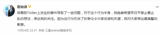 隨后,崔始源也在微博發(fā)文回應(yīng):“我看到Twitter上發(fā)生的事件導(dǎo)致了一些問題,對于這個行為本身,我抱著希望早日平息止暴止亂的想法,表達(dá)我的關(guān)注。因為這行為引發(fā)了的爭論令大家反感和失望,我對大家表達(dá)最真摯的歉意。”