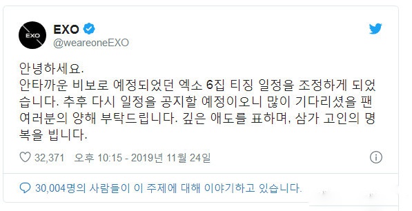 網易娛樂11月25日報道 韓國男團EXO通過官方賬號發文表示,回歸預告將延期發布。文中寫道:“大家好,因為令人遺憾的噩耗,原本預計的EXO正規6輯預告發布日程將進行變更。我們將在之后另行公布日程,希望等待的粉絲們予以諒解。在此表達我們深深的哀悼,為故人祈求冥福。”
