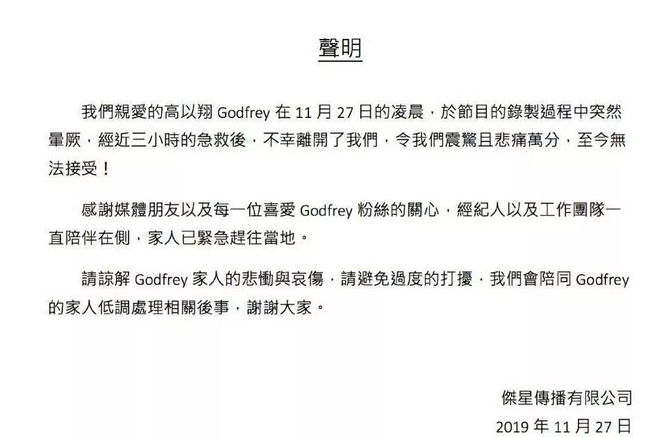 11月27日凌晨,著名藝人高以翔在錄制節(jié)目過(guò)程中逝世,其生前所在的經(jīng)紀(jì)公司發(fā)布了相關(guān)聲明: