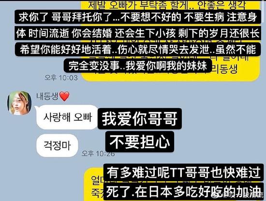網(wǎng)易娛樂11月28日報(bào)道 11月27日,具荷拉的哥哥在個(gè)人社交網(wǎng)站上傳了與妹妹生前最后的聊天記錄截圖,并寫道:“很抱歉我們都沒再大一點(diǎn)聲告訴你,希望你永遠(yuǎn)快樂永遠(yuǎn)幸福,雖然現(xiàn)在為時(shí)已晚,但是還是希望你能聽到我們的聲音,在沒有壞人的凈土要沒有任何煩惱,比任何人都要幸福地生活呀”。聊天記錄中,哥哥懇切地希望具荷拉可以拋棄不好的想法:“哥哥拜托你了…不要再想一些不好的想法了,不要再受傷了,好好照顧健康,隨著時(shí)間的流逝,結(jié)婚生子,剩下的人生能幸福的度過就好了…我愛你,我的妹妹”