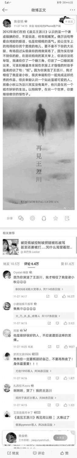 與“王瀝川”溫暖形象相近,接觸過高以翔的工作人員也幾乎都稱贊他紳士、溫柔。昨日高以翔離世之后,鄧超、陳赫、鹿晗、秦嵐、焦俊艷等不少明星好友都紛紛發微博悼念,秦嵐寫道,“前兩天活動上碰到,你還在跟我聊天,問我渴不渴專門去拿水給我。那么紳士那么愛動物那么愛生命愛生活的你,慢熱害羞但殺青時跟每個工作人員擁抱的你,跟我約好去臺灣帶我吃好吃的你,巴黎的時候說到自己后面馬上要拍的電影興致勃勃的你,永遠那么專業好合作照顧所有人的你。這么好的你,愿安息。”