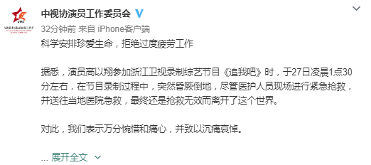 網易娛樂11月28日報道 11月27日,高以翔在錄制綜藝節目《追我吧》時意外猝逝,年僅35歲。28日,中視協演員工作委員會就事件發聲,呼吁“科學安排珍愛生命,拒絕過度疲勞工作”。
