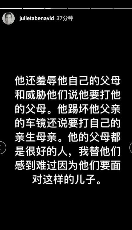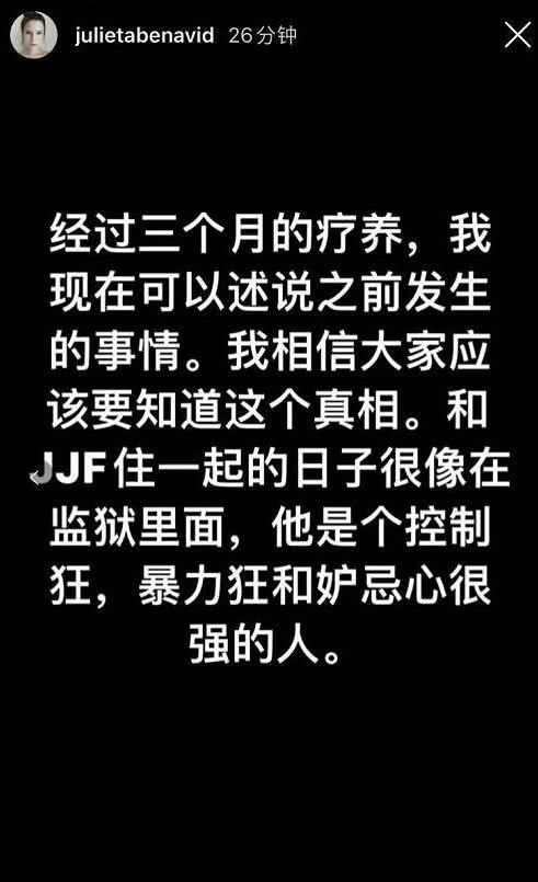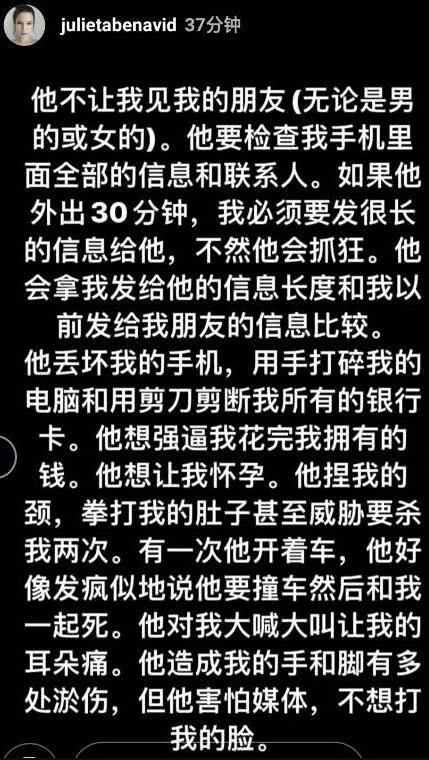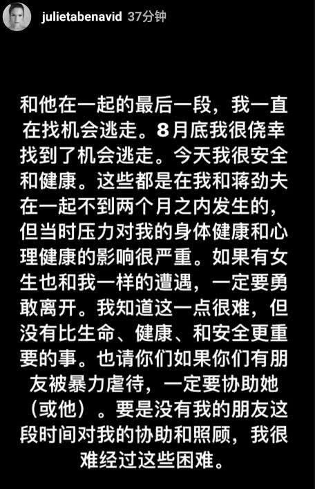 11月26日晚間,蔣勁夫的烏拉圭女友在INS上控訴蔣勁夫家暴,她表示自己療養了三個月終于可以向網友訴說真相。該女子指出蔣勁夫不僅是個暴力狂,還是個控制狂,嫉妒心極強。其中指出蔣勁夫不僅對自己家暴,還對家里的東西打砸,甚至對自己的父母進行傷害,自己都對他的父母感到傷心和難過。
