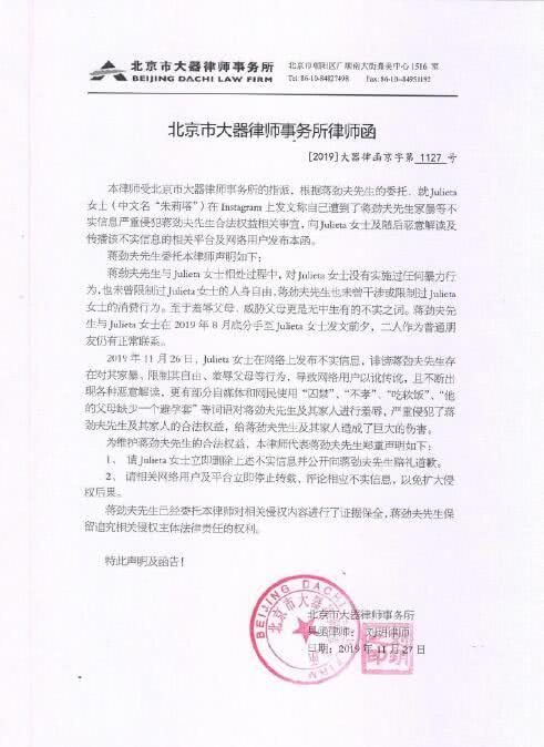 11月27日,蔣勁夫通過律師發布了律師聲明否認了家暴一事。聲明中表示,Julieta稱自己遭到了蔣勁夫家暴等不實信息嚴重侵犯了蔣勁夫合法權益相關事宜,蔣勁夫在與Julieta相處過程中并沒有實施過任何暴力行為,也沒限制其人身自由、干涉其消費行為,羞辱、威脅父母更是無中生有,要求女方刪除以上信息并向蔣勁夫道歉。
