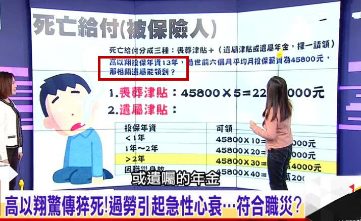 除此之外,高以翔的家屬還可以領到一筆遺囑津貼,投保兩年的人,家屬可以一次性領到30個月乘以保資的津貼。根據高以翔的情況,他的家屬得到的津貼為137萬臺幣(約合31萬人民幣)