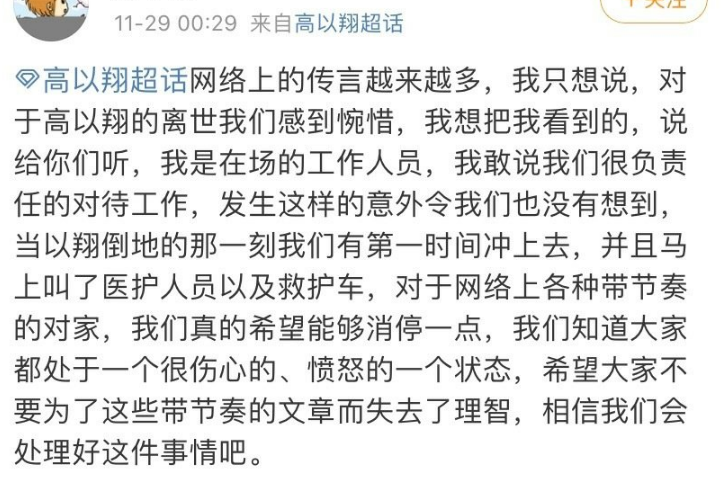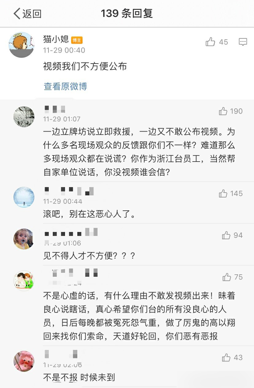 網(wǎng)易娛樂11月30日報道 11月29日,有位自稱是浙江衛(wèi)視《追我吧》的工作人員在社交平臺發(fā)聲,稱現(xiàn)場的工作人員都有很認(rèn)真的對待工作,高以翔倒地后第一時間就沖了上去。至于網(wǎng)絡(luò)上各種“帶節(jié)奏的對家”,希望他們“能夠消停一點(diǎn)”,還呼吁網(wǎng)友不要被帶節(jié)奏的文章影響失去理智。而當(dāng)網(wǎng)友詢問現(xiàn)場視頻時,得到的回復(fù)則是“我們不方便公布”。