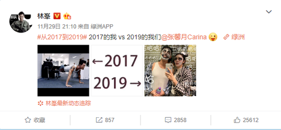 網易娛樂12月1日報道 近日,林峯首次在社交平臺曬出了與張馨月的合照高調秀恩愛,還用近期在網絡大熱的“2017,2019”模板曬出兩年前與現在的對比照。林峯曬出的照片中,2017年是他獨自健身的照片,2019年則是和張馨月的甜蜜合影。